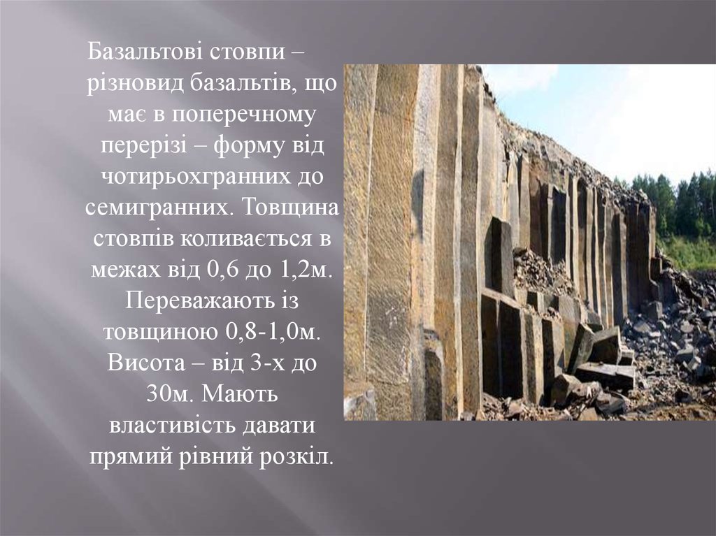 Базальт – це рідкісна вулканічного походження порода, що має впоперечному перерізі форму від чотиригранної до семигранної. Товщина