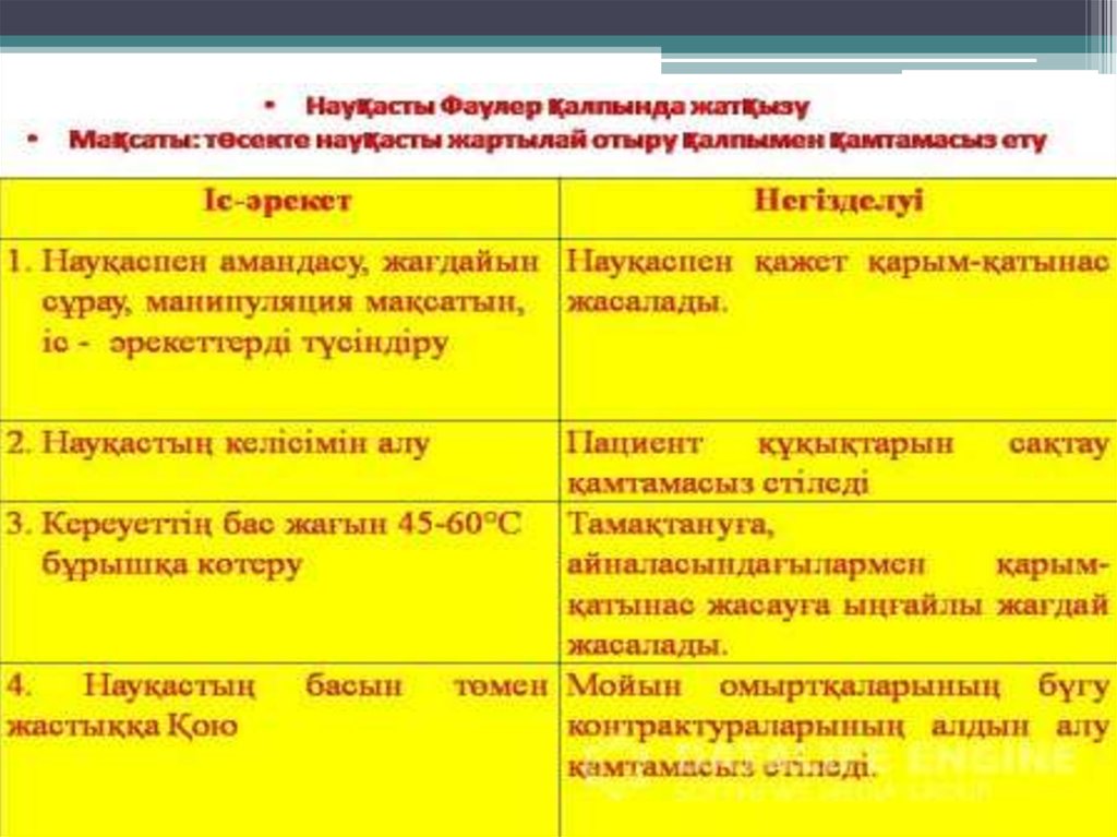 7. Фаулер қалпында төсекте науқасты жартылай отыру қалпымен