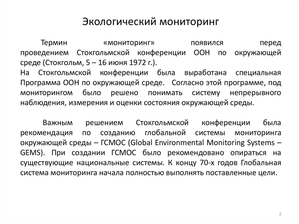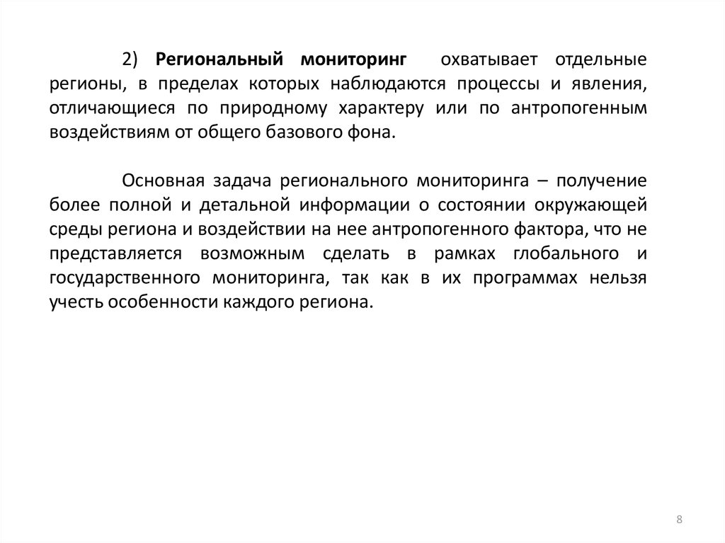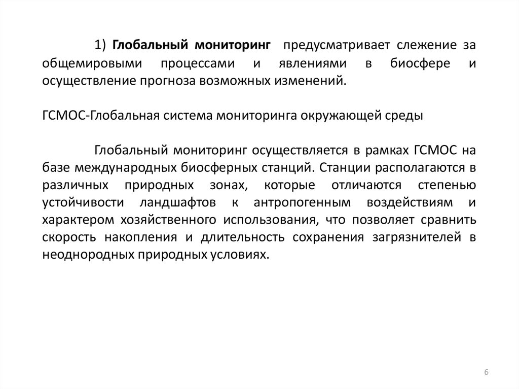 1) Глобальный мониторинг предусматривает слежение заобщемировыми процессами и явлениями в биосфере и