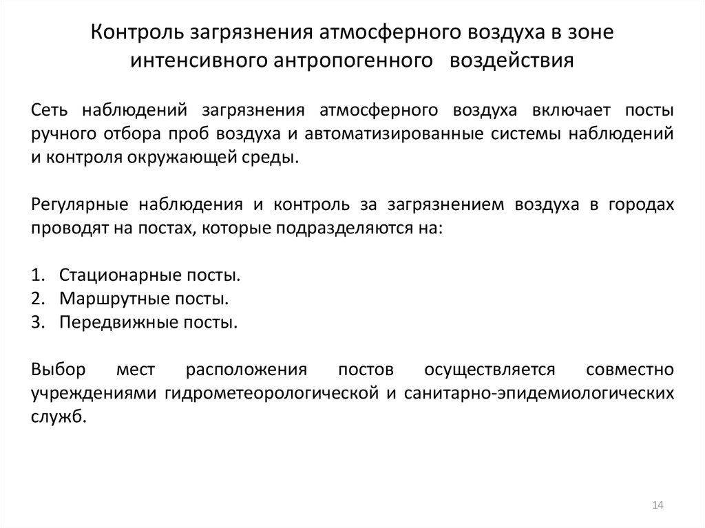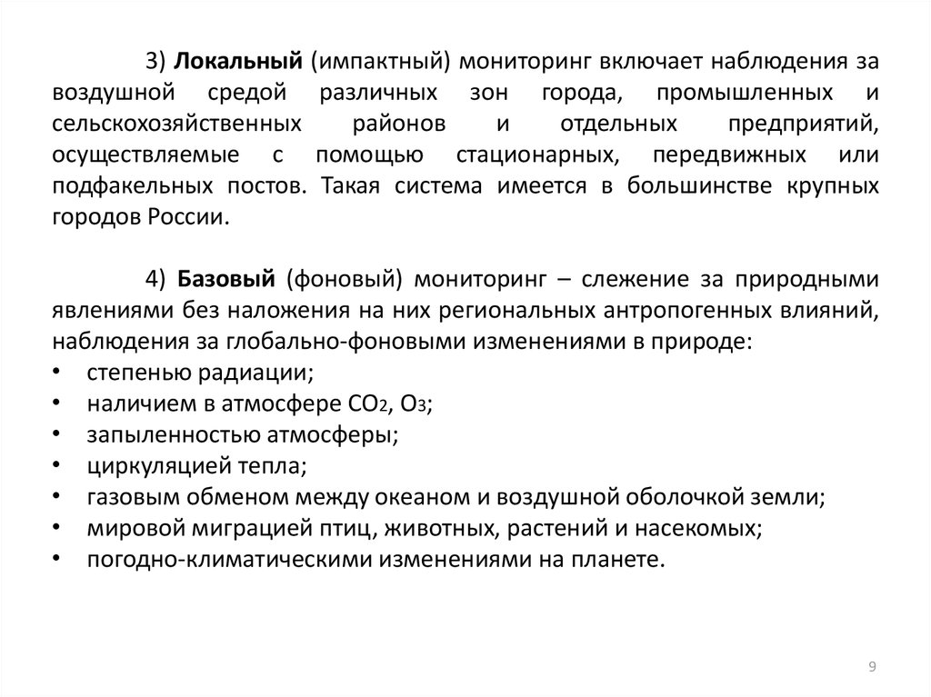 3) Локальный (импактный) мониторинг включает наблюдения завоздушной средой различных зон города, промышленных и