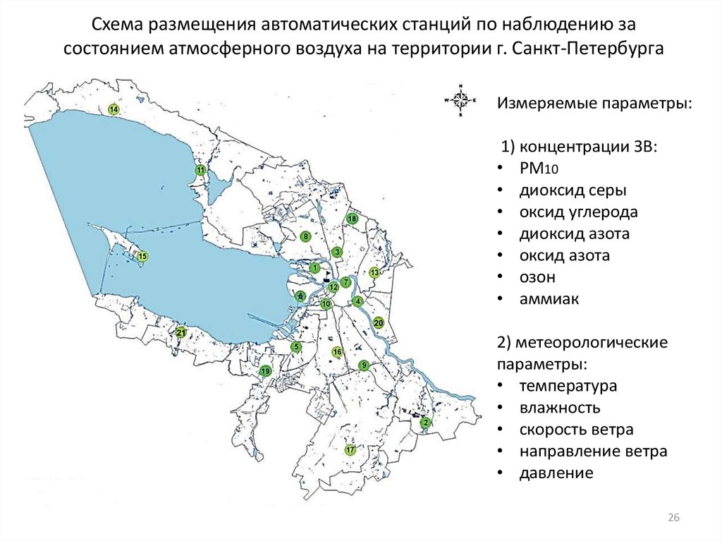 Схема размещения автоматических станций по наблюдению засостоянием атмосферного воздуха на территории г. Санкт-Петербурга