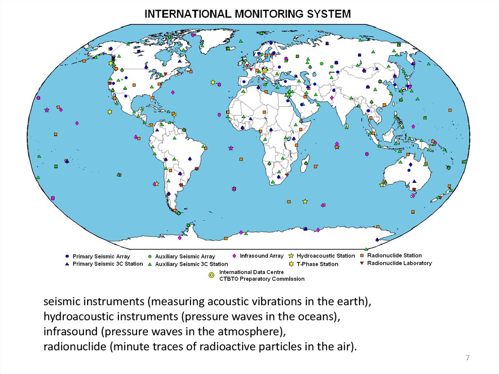 seismic instruments (measuring acoustic vibrations in the earth),hydroacoustic instruments (pressure waves in the oceans),