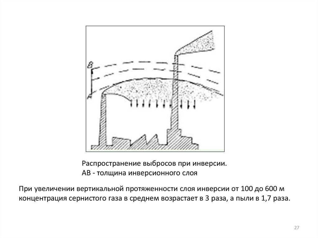 Распространение выбросов при инверсии.АВ - толщина инверсионного слоя