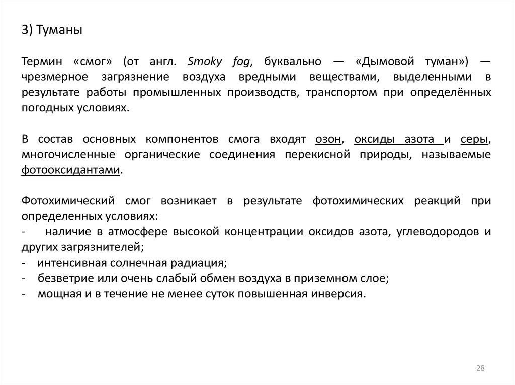 3) ТуманыТермин «смог» (от англ. Smoky fog, буквально — «Дымовой туман») —