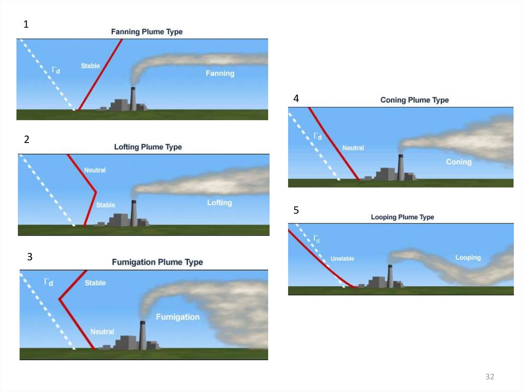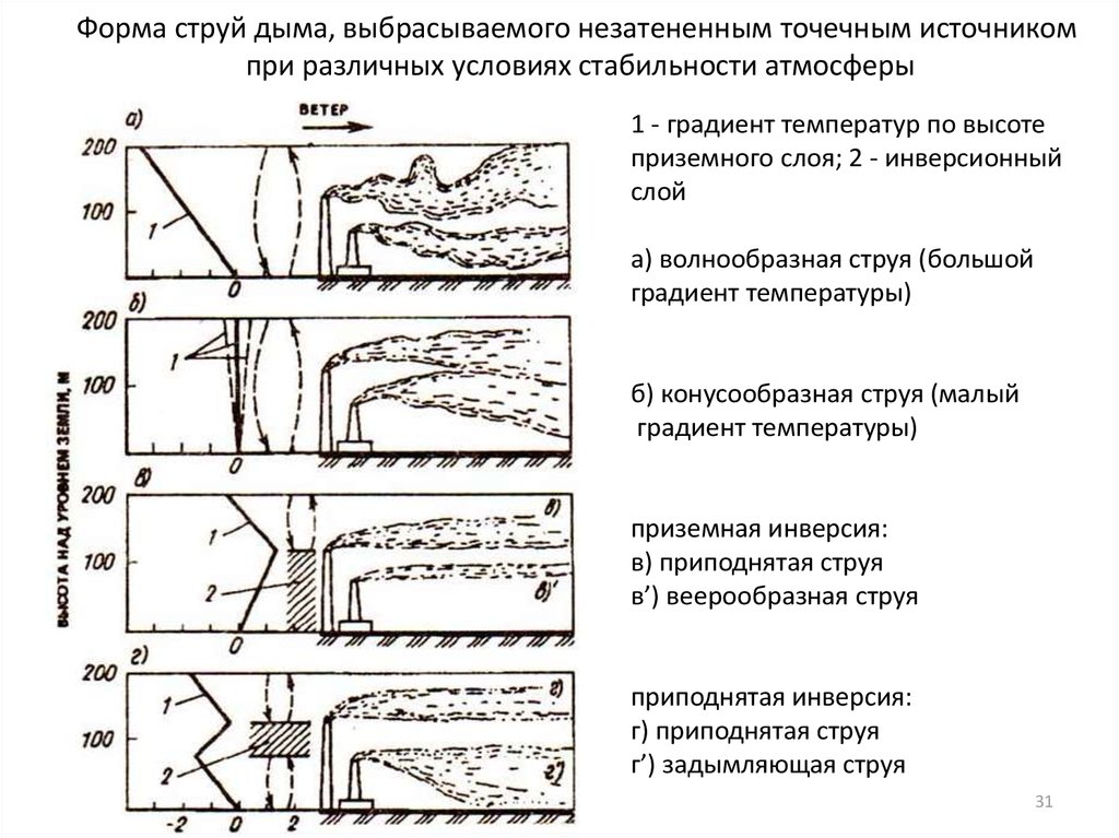 Форма струй дыма, выбрасываемого незатененным точечным источникомпри различных условиях стабильности атмосферы