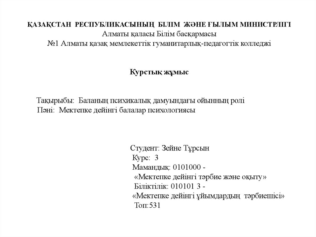 Тақырыбы: Баланың психикалық дамуындағы ойынның ролі