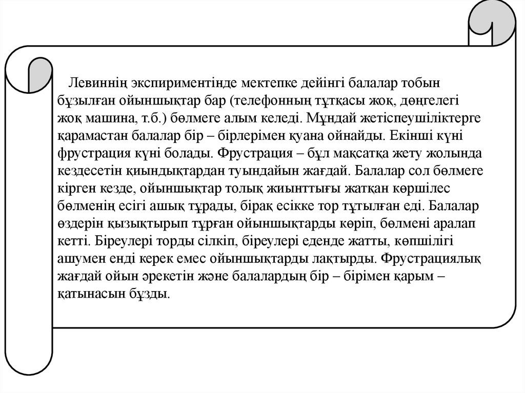 Левиннің экспириментінде мектепке дейінгі балалар тобынбұзылған ойыншықтар бар (телефонның тұтқасы жоқ, дөңгелегі