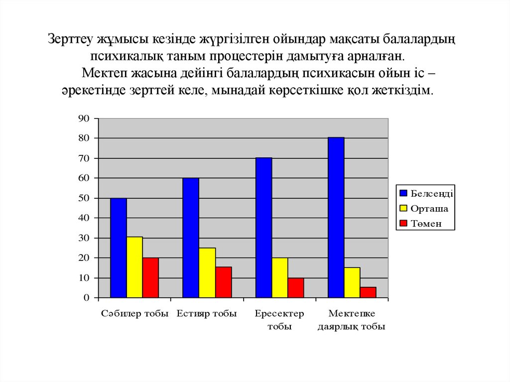 Зерттеу жұмысы кезінде жүргізілген ойындар мақсаты балалардыңпсихикалық таным процестерін дамытуға арналған.