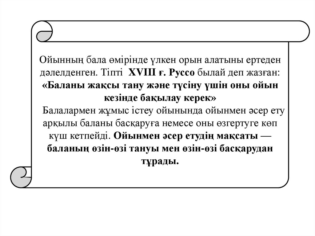 Ойынның бала өмірінде үлкен орын алатыны ертедендәлелденген. Тіпті XVIII ғ. Руссо былай деп жазған: