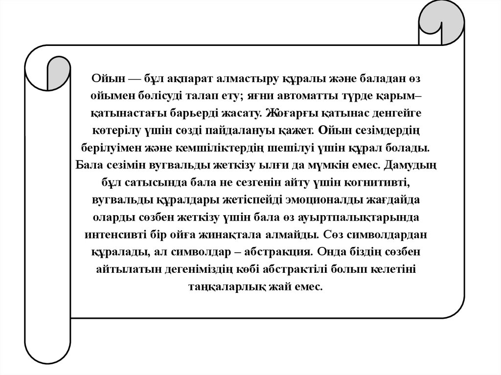 Ойын — бұл ақпарат алмастыру құралы және баладан өзойымен бөлісуді талап ету; яғни автоматты түрде қарым–