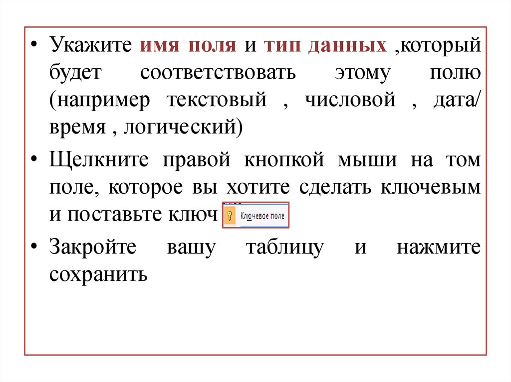 число, дата, логическое, счетчик и т.д.) ,