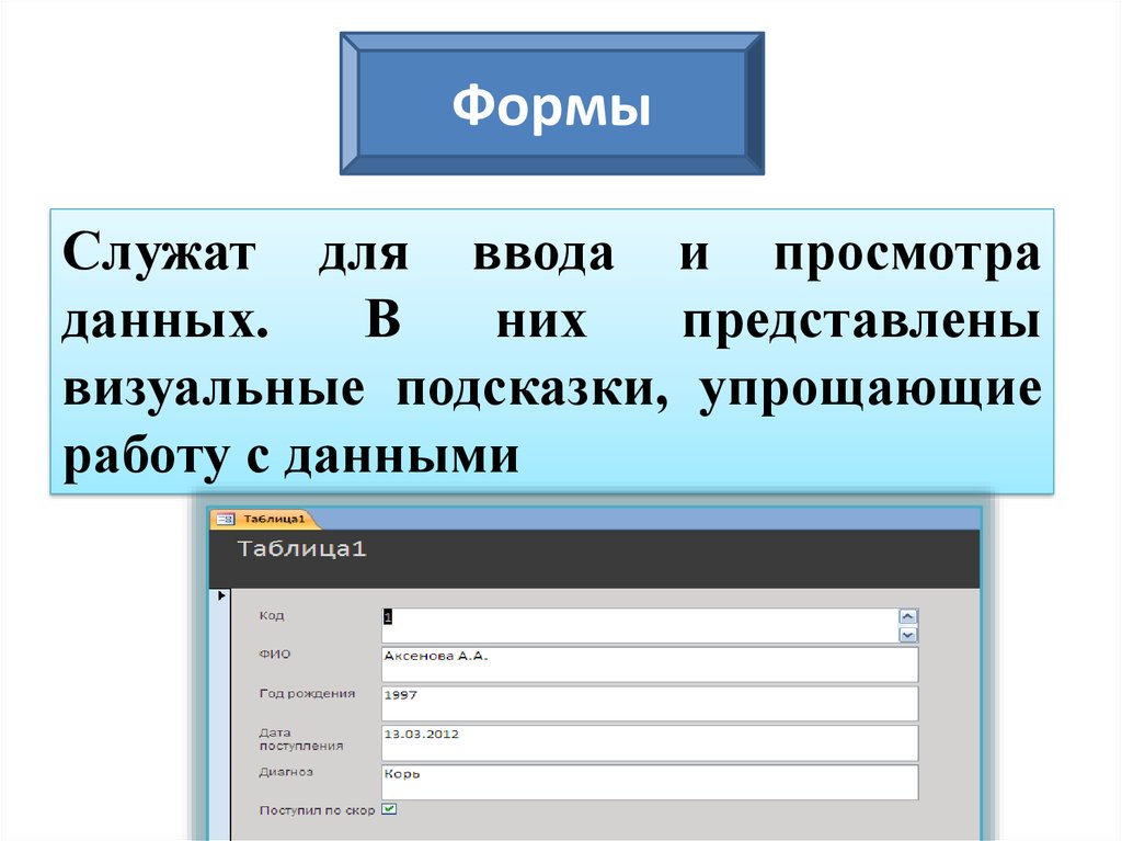 Формы предназначены для удобства внесения и просмотра данныхпользователем. Существует два способа создания форм: