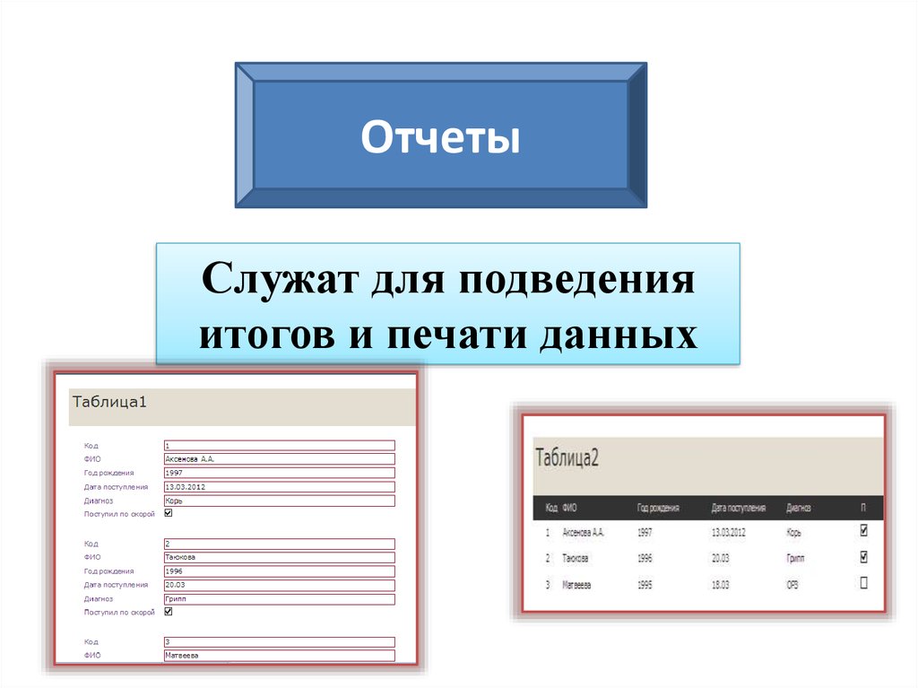 Отчеты предназначены для просмотра и распечатки данных запроса вудобном виде.