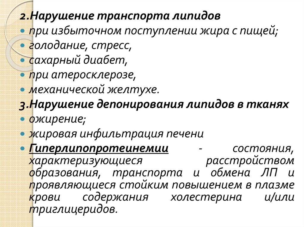 2.Нарушение транспорта липидовпри избыточном поступлении жира с пищей;