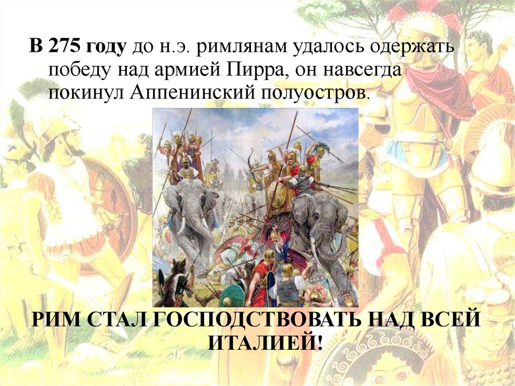 В 275 году до н.э. римлянам удалось одержатьпобеду над армией Пирра, он навсегда