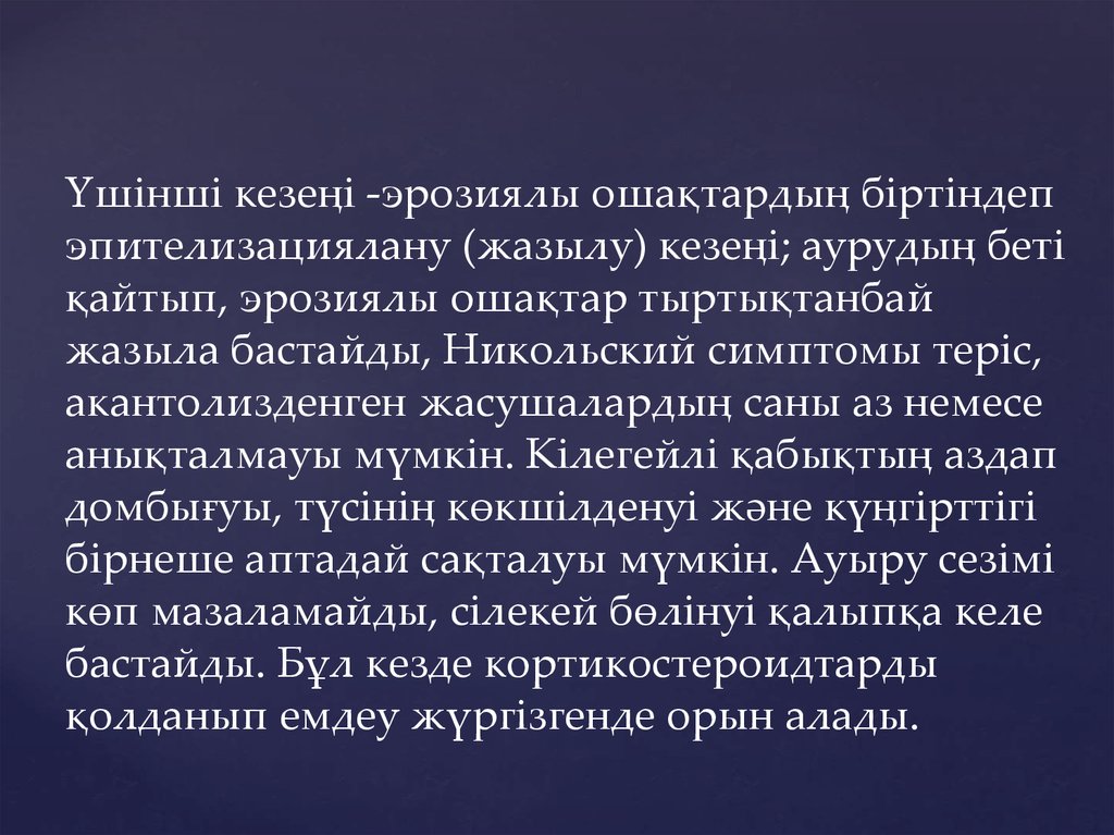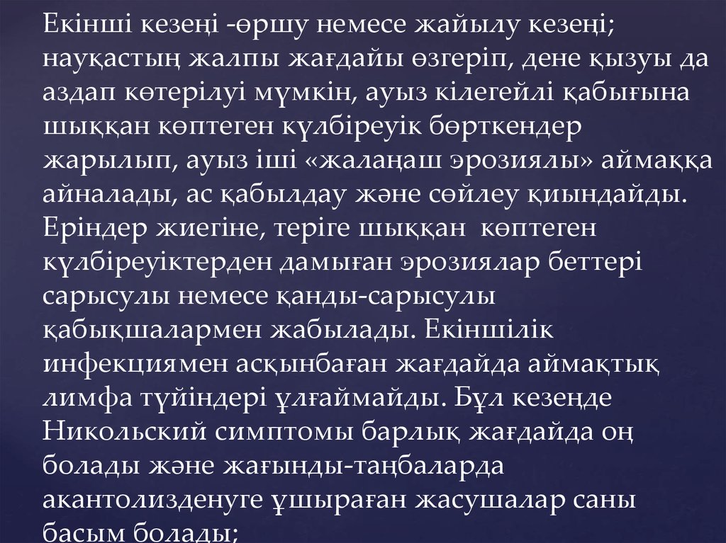 бастапқы кезеңі (начальная фаза), науқастың жалпыжағдайы өзгермейді, бөрткендер саны аз, эрозия