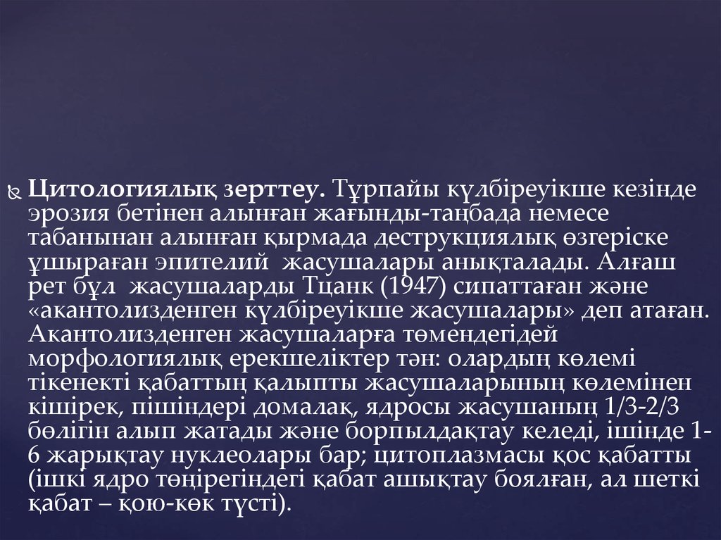 Цитологиялық зерттеу. Тұрпайы күлбіреуікше кезіндеэрозия бетінен алынған жағынды-таңбада немесе