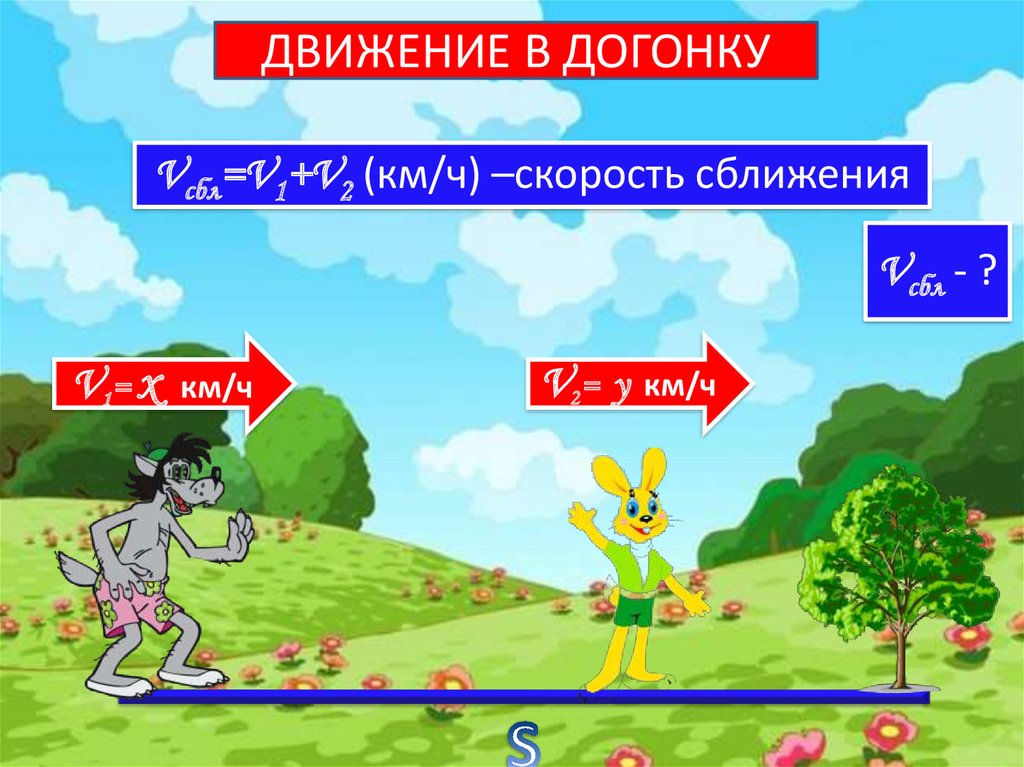 ДВИЖЕНИЕ В ДОГОНКУVсбл=V1+V2 (км/ч) –скорость сближения