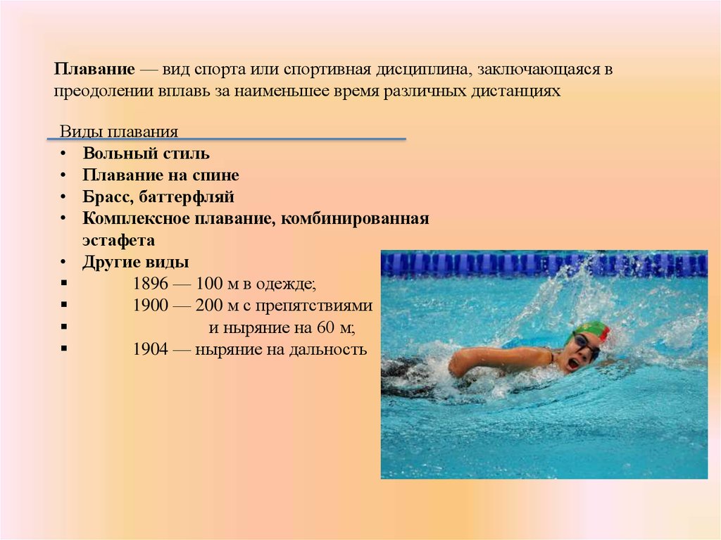 Плавание — вид спорта или спортивная дисциплина, заключающаяся впреодолении вплавь за наименьшее время различных дистанциях