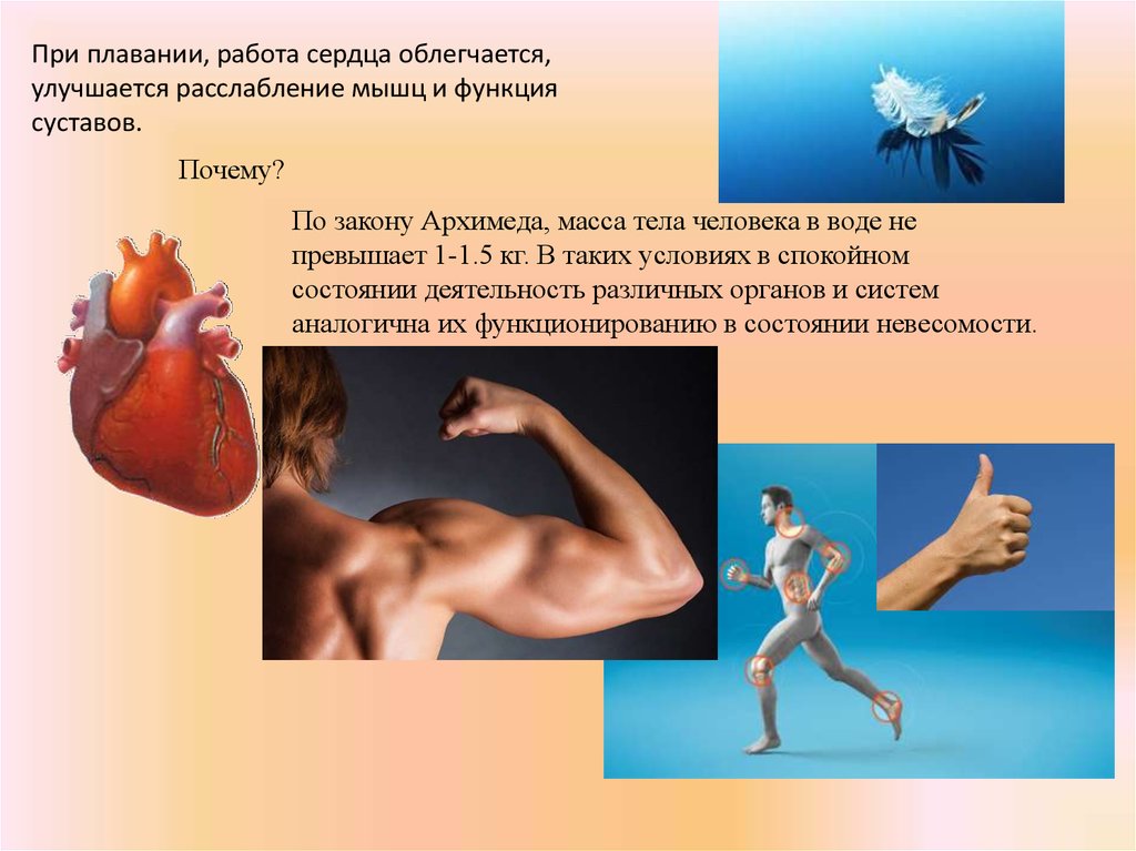 При плавании, работа сердца облегчается,улучшается расслабление мышц и функция