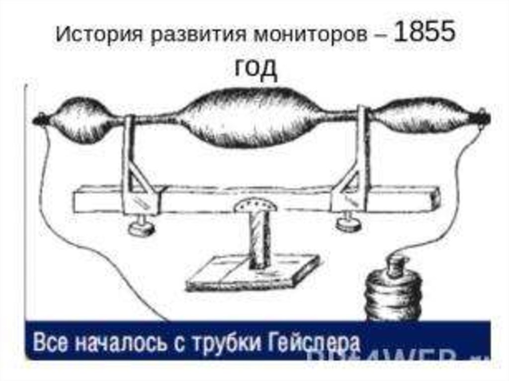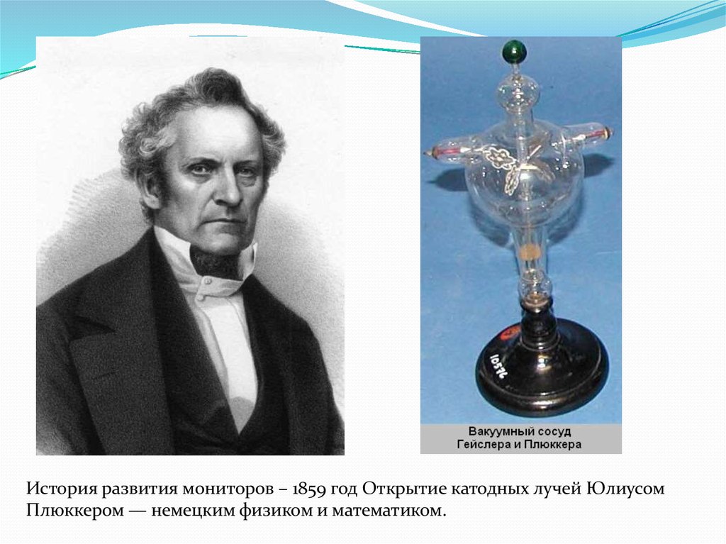 История развития мониторов – 1859 год Открытие катодных лучей ЮлиусомПлюккером — немецким физиком и математиком.