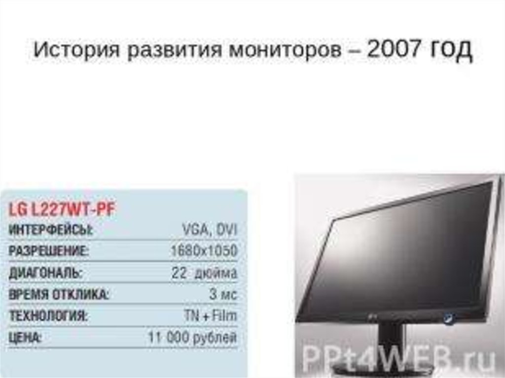 Эволюция: от телевизора до монитора К 2000 году на потребительскийрынок прорвались мониторы с жидкокристаллическим экраном. После