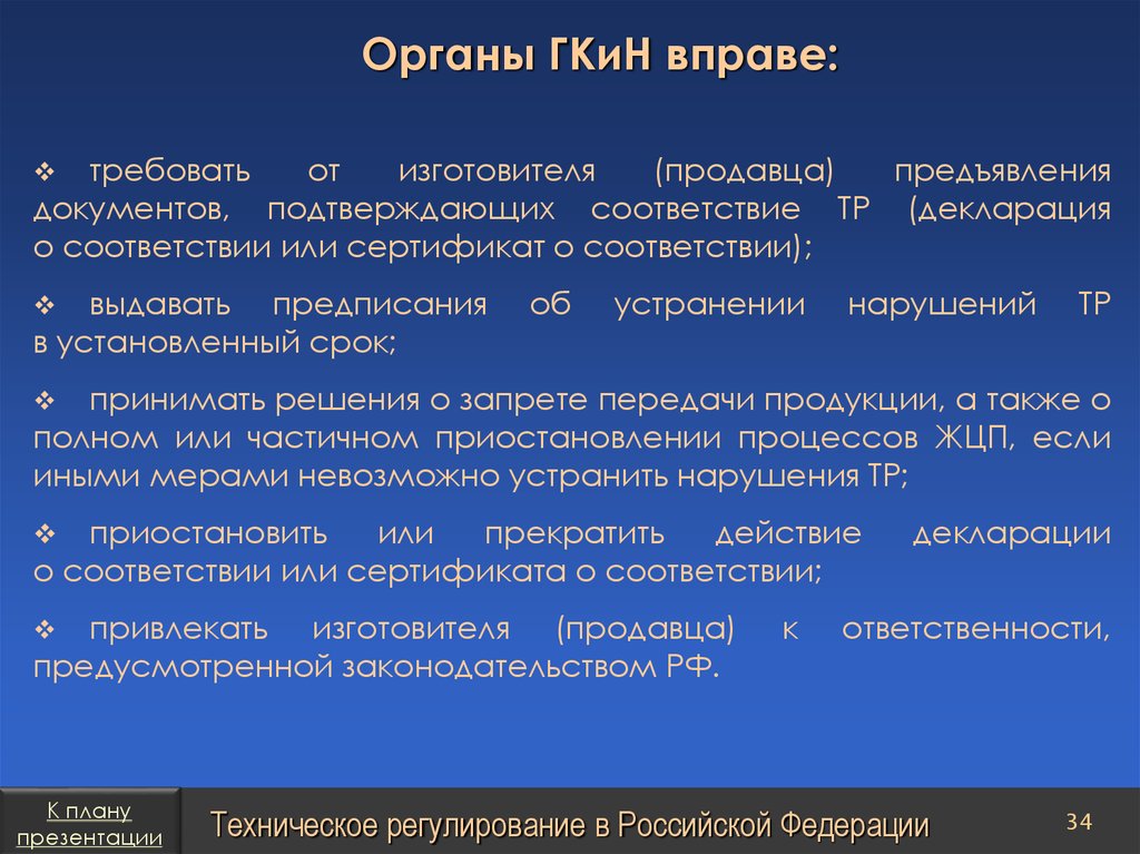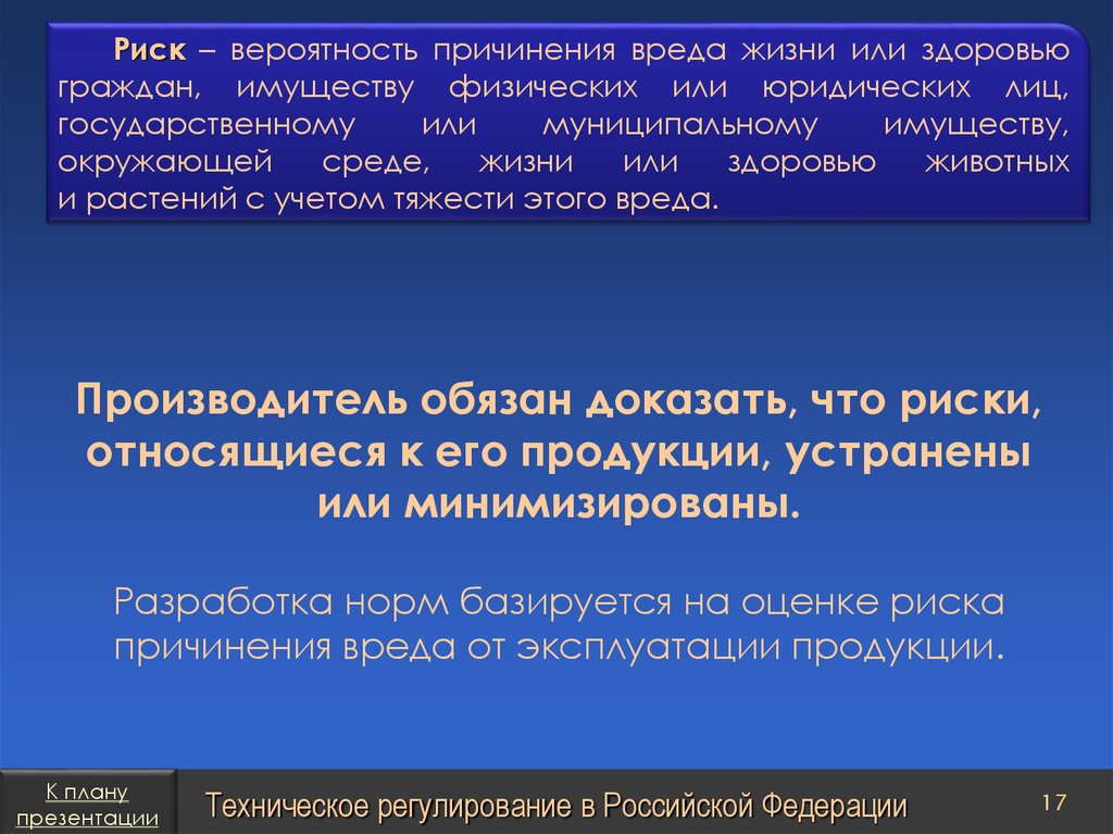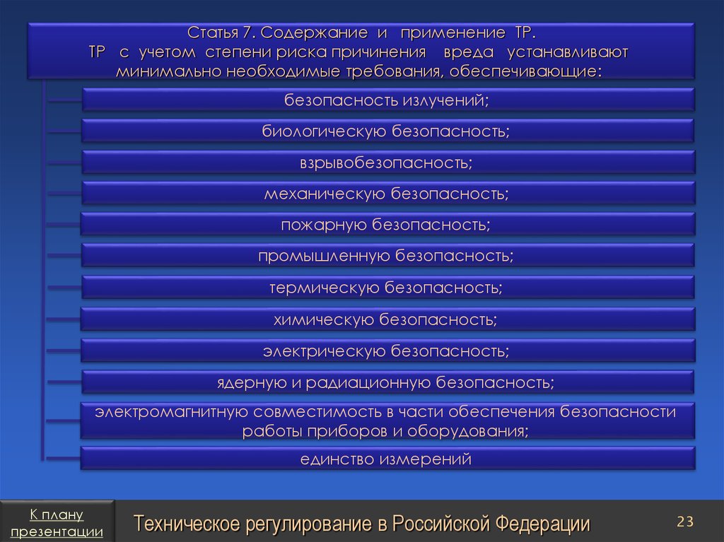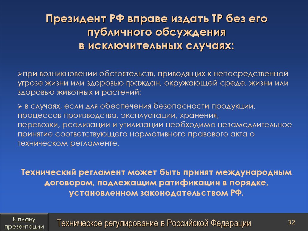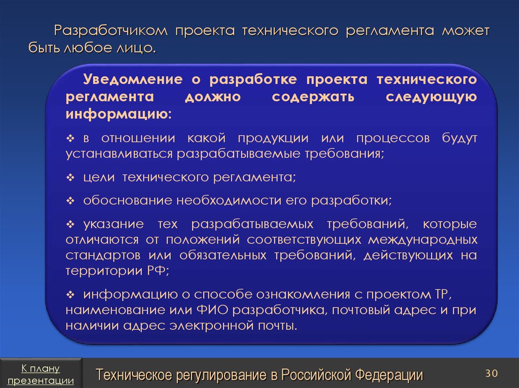 План презентацииТехническое регулирование в Российской Федерации