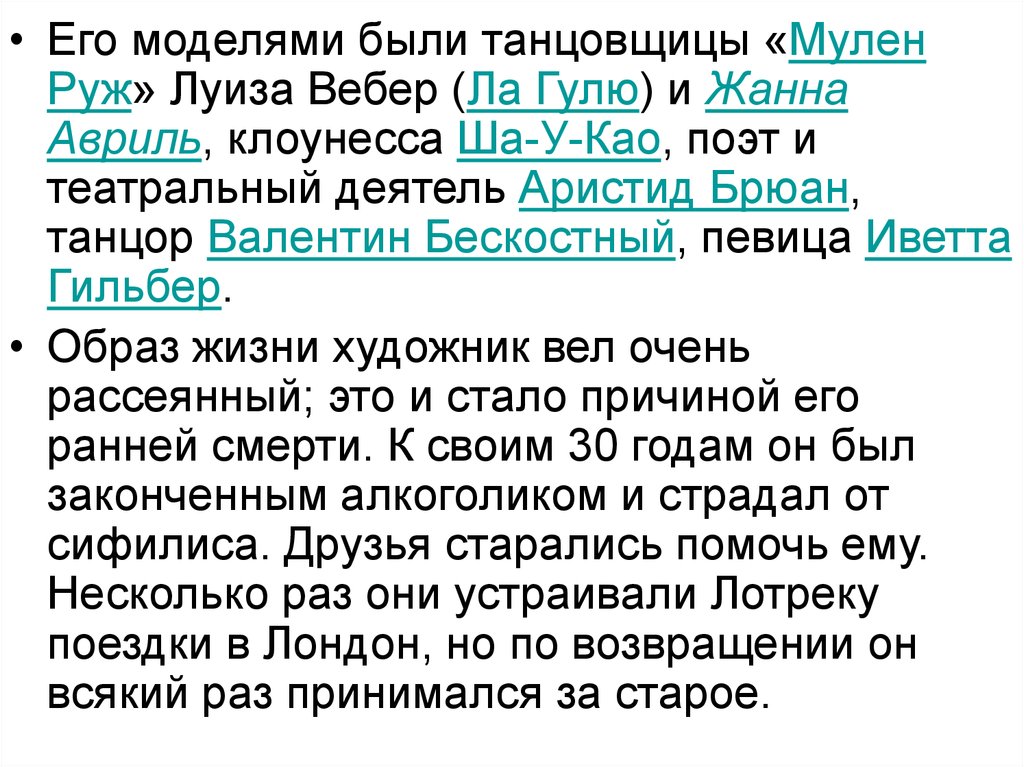 • Его моделями были танцовщицы «МуленРуж» Луиза Вебер (Ла Гулю) и Жанна