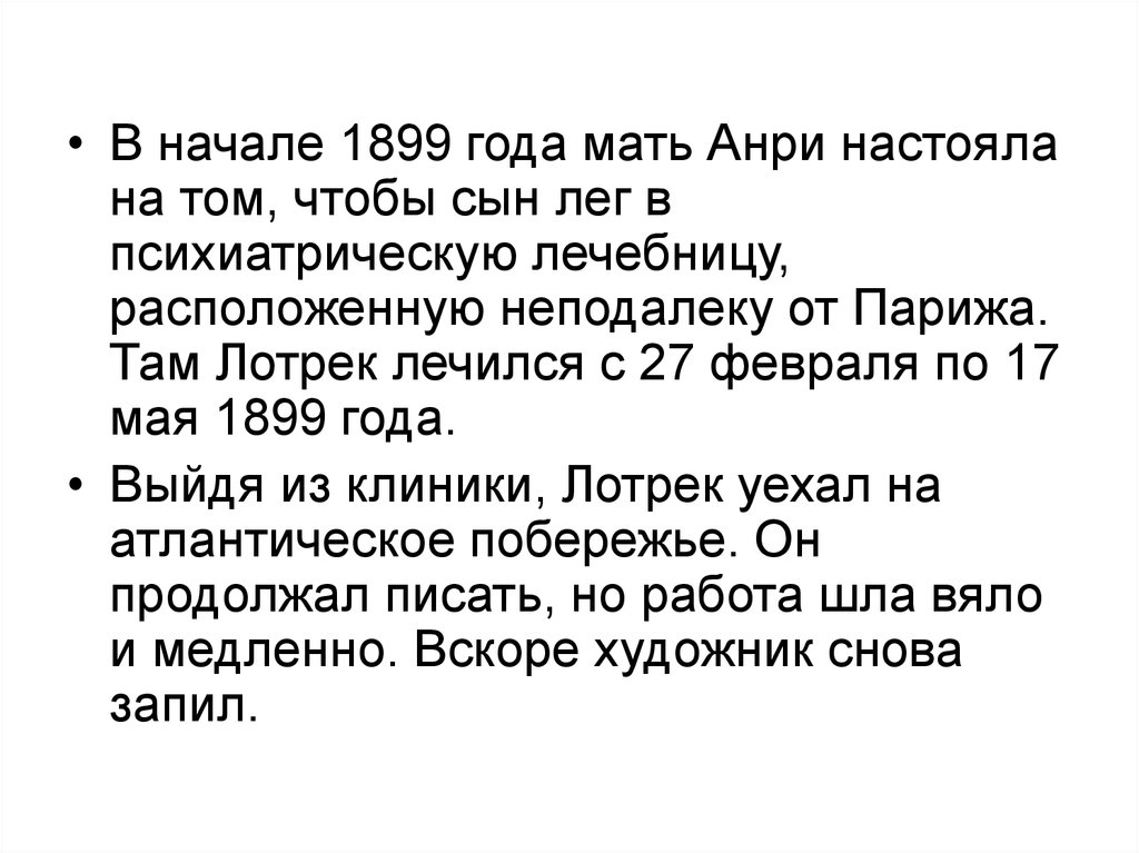 Там Лотрек лечился с 27 февраля по 17