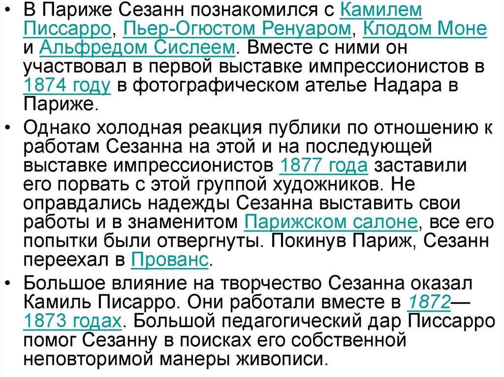 • В Париже Сезанн познакомился с КамилемПиссарро, Пьер-Огюстом Ренуаром, Клодом Моне
