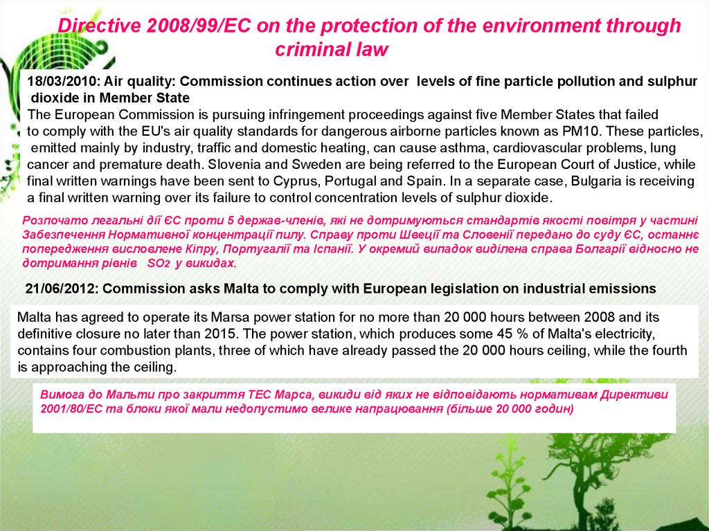 неадекватну їхню імплементацію. Наприклад, у 2007 році розпочато юридичні дії проти 14 країнчленів ЄС за невідповідне потрактування Директиви ЄС щодо скидання відходів у відвали та