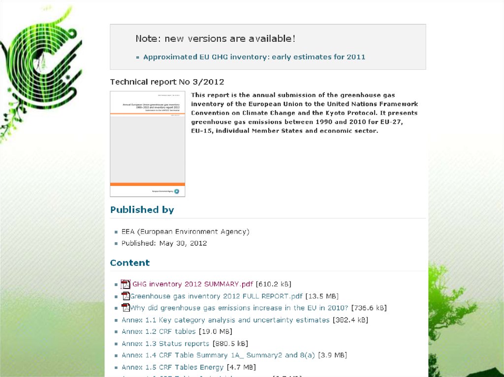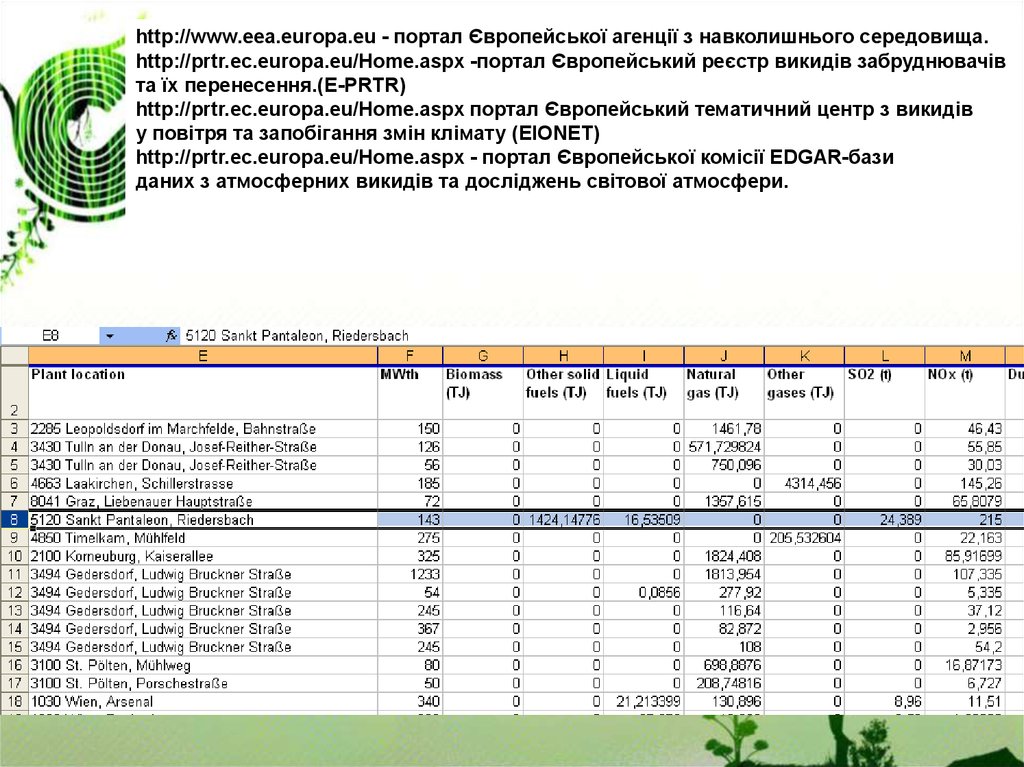 http://www.eea.europa.eu - портал Європейської агенції з навколишнього середовища.http://prtr.ec.europa.eu/Home.aspx -портал Європейський реєстр викидів забруднювачів