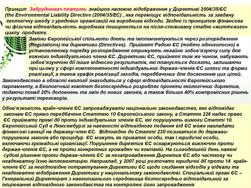 парламенту, а Екологічний комітет безпосередньо розробляє проекти екологічних директив,
