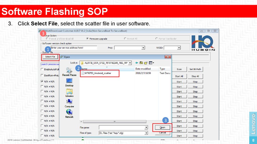 Software Flashing SOP3. Click Select File, select the scatter file in user software.