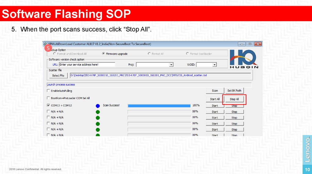 Software Flashing SOP5. When the port scans success, click “Stop All”.