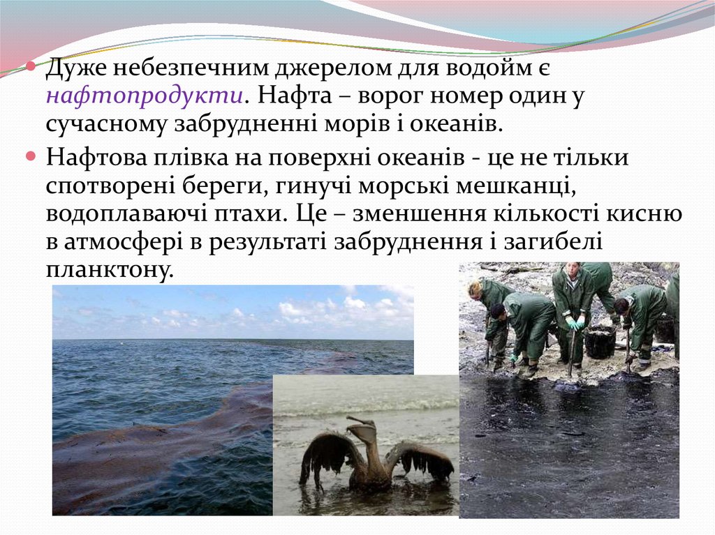 Дуже небезпечним джерелом для водойм єнафтопродукти. Нафта – ворог номер один у