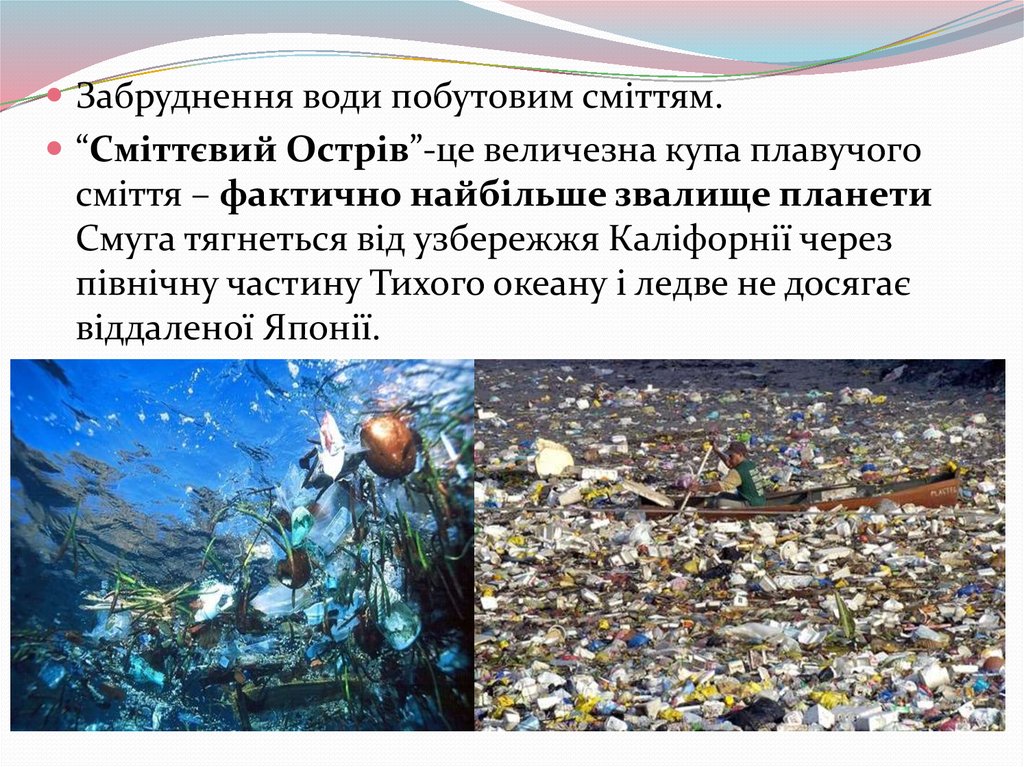 Забруднення води побутовим сміттям.“Сміттєвий Острів”-це величезна купа плавучого