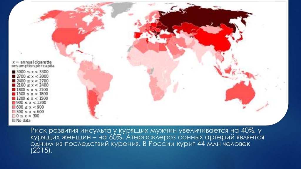 Риск развития инсульта у курящих мужчин увеличивается на 40%, укурящих женщин – на 60%. Атеросклероз сонных артерий является