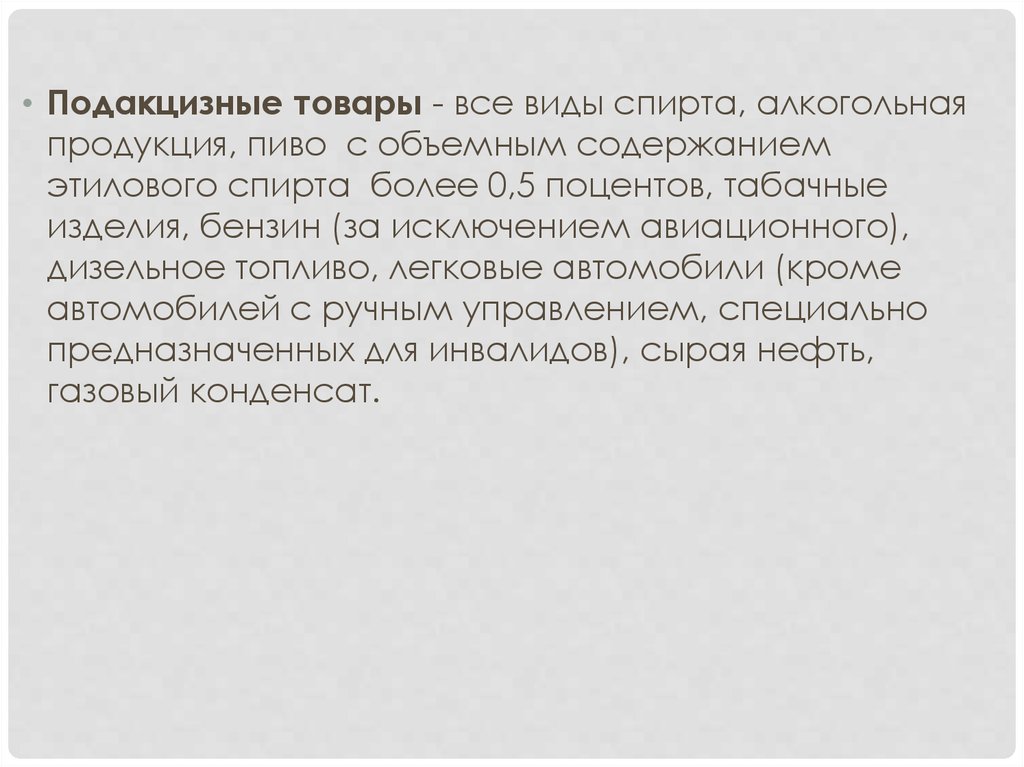 • Подакцизные товары - все виды спирта, алкогольнаяпродукция, пиво с объемным содержанием