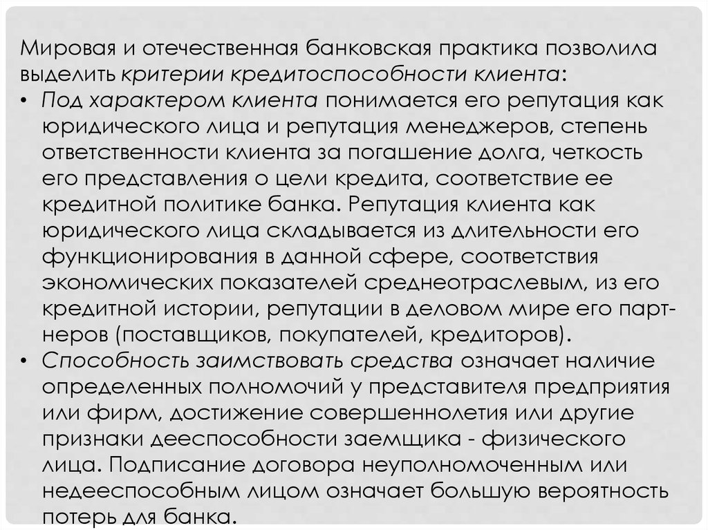 Мировая и отечественная банковская практика позволилавыделить критерии кредитоспособности клиента: