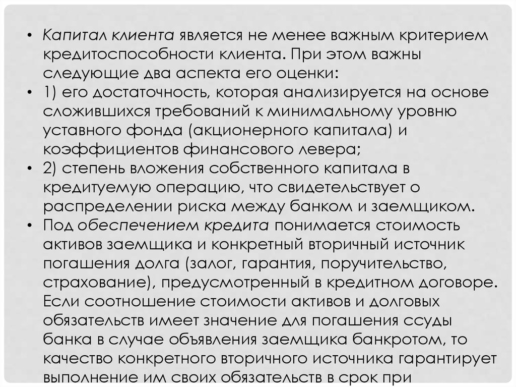 • Капитал клиента является не менее важным критериемкредитоспособности клиента. При этом важны