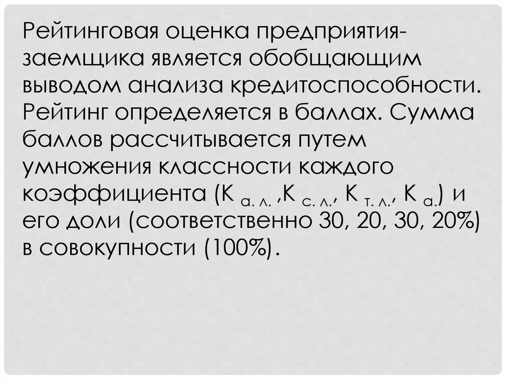 Рейтинговая оценка предприятиязаемщика является обобщающимвыводом анализа кредитоспособности.