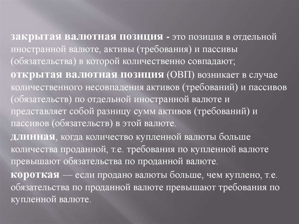 закрытая валютная позиция - это позиция в отдельнойиностранной валюте, активы (требования) и пассивы