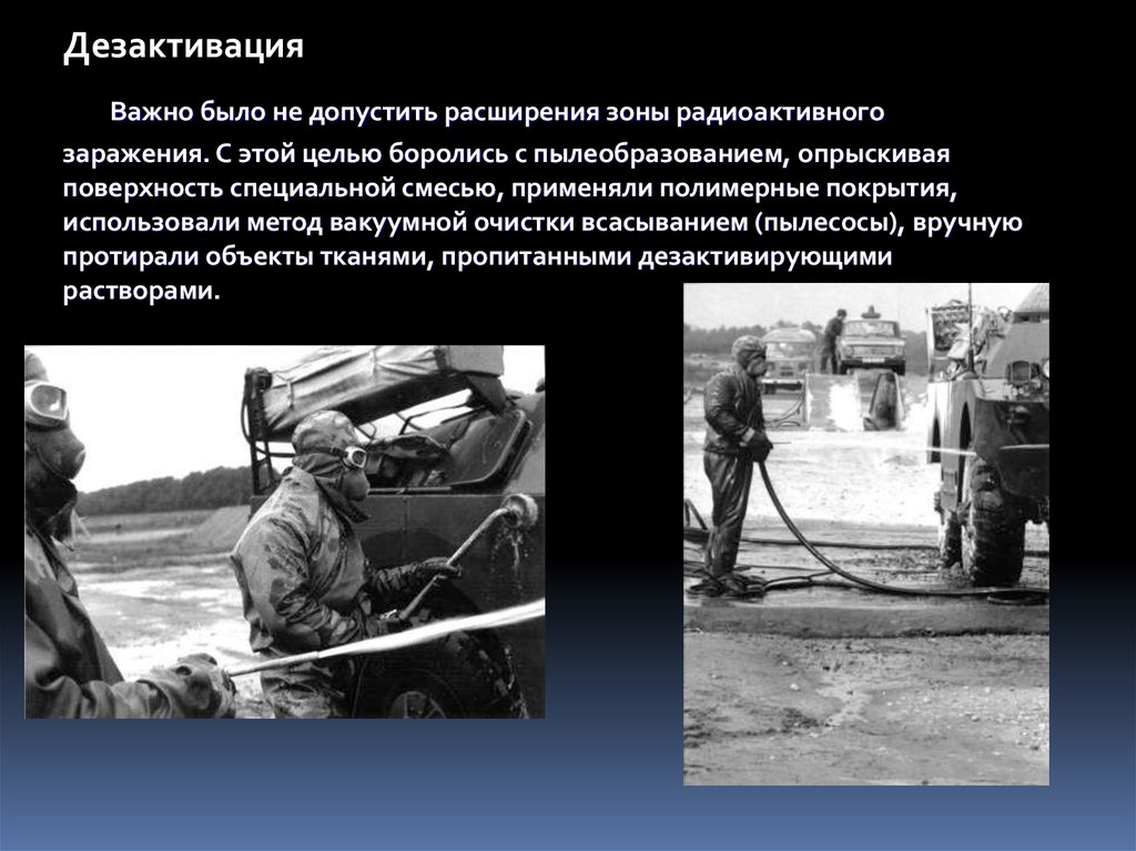 ДезактивацияВажно было не допустить расширения зоны радиоактивного