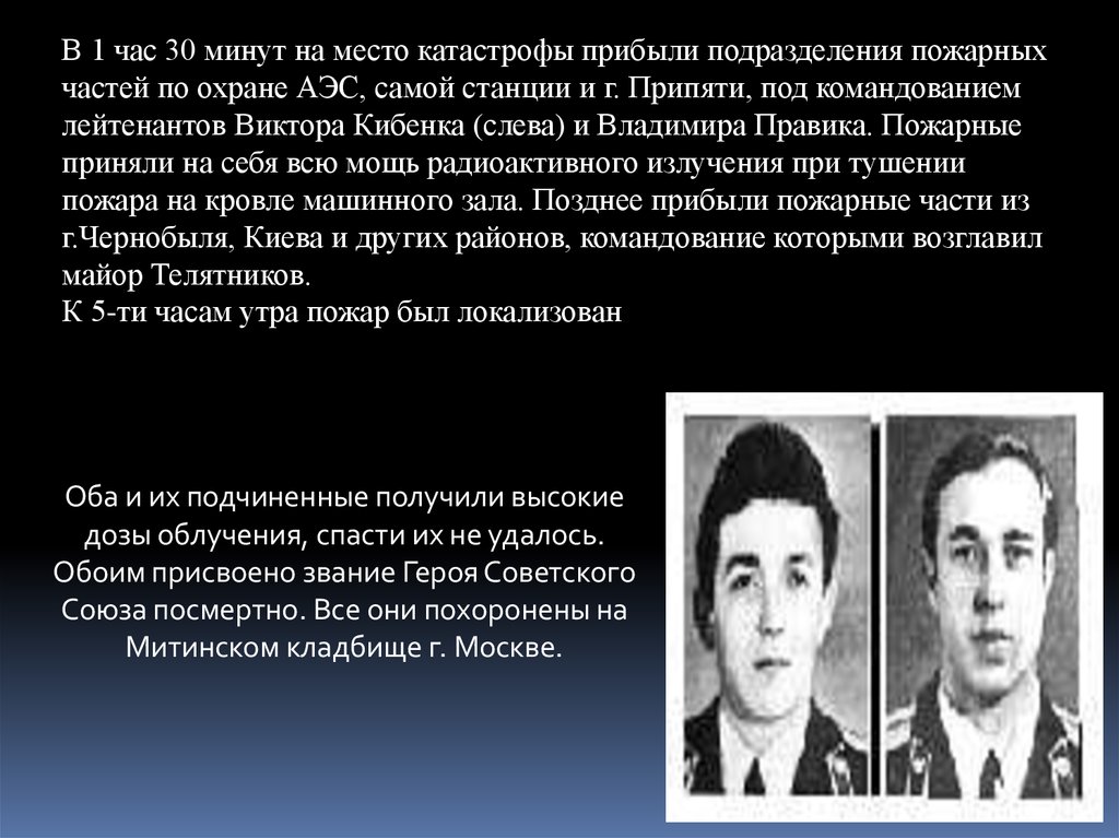 В 1 час 30 минут на место катастрофы прибыли подразделения пожарныхчастей по охране АЭС, самой станции и г. Припяти, под командованием
