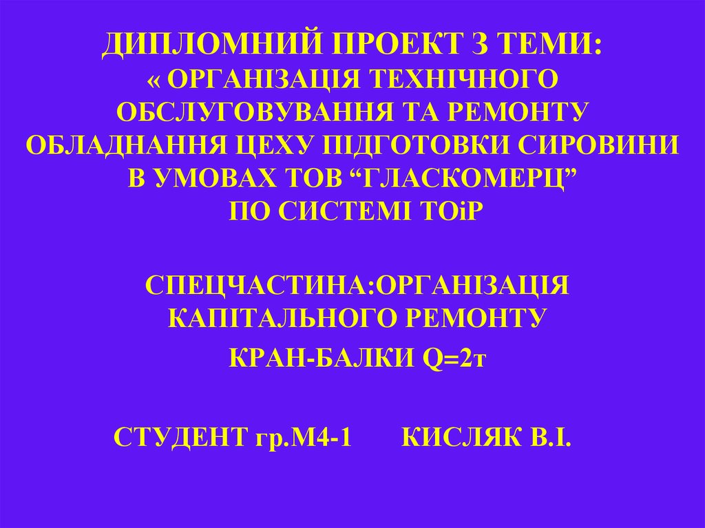 1. ДИПЛОМНИЙ ПРОЕКТ З ТЕМИ: « ОРГАНІЗАЦІЯ ТЕХНІЧНОГО ОБСЛУГОВУВАННЯ ТА РЕМОНТУ ОБЛАДНАННЯ ЦЕХУ ПІДГОТОВКИ СИРОВИНИ В УМОВАХ ТОВ “ГЛАСКОМЕРЦ