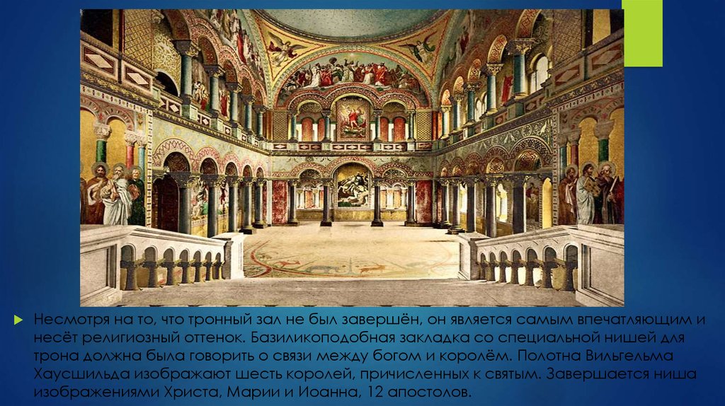Несмотря на то, что тронный зал не был завершён, он является самым впечатляющим инесёт религиозный оттенок. Базиликоподобная закладка со специальной нишей для