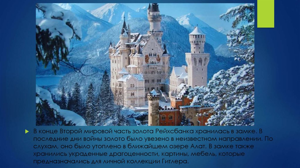 В конце Второй мировой часть золота Рейхсбанка хранилась в замке. Впоследние дни войны золото было увезено в неизвестном направлении. По