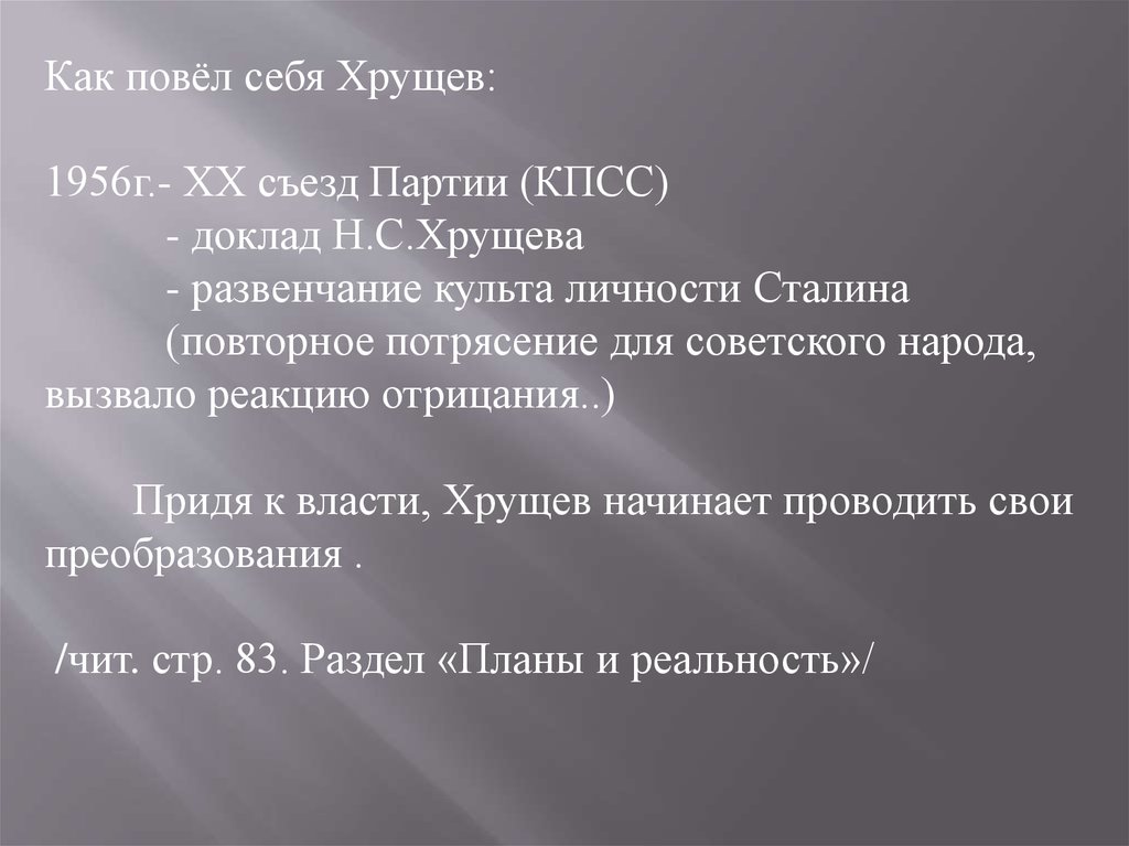 Как повёл себя Хрущев:1956г.- ХХ съезд Партии (КПСС)
