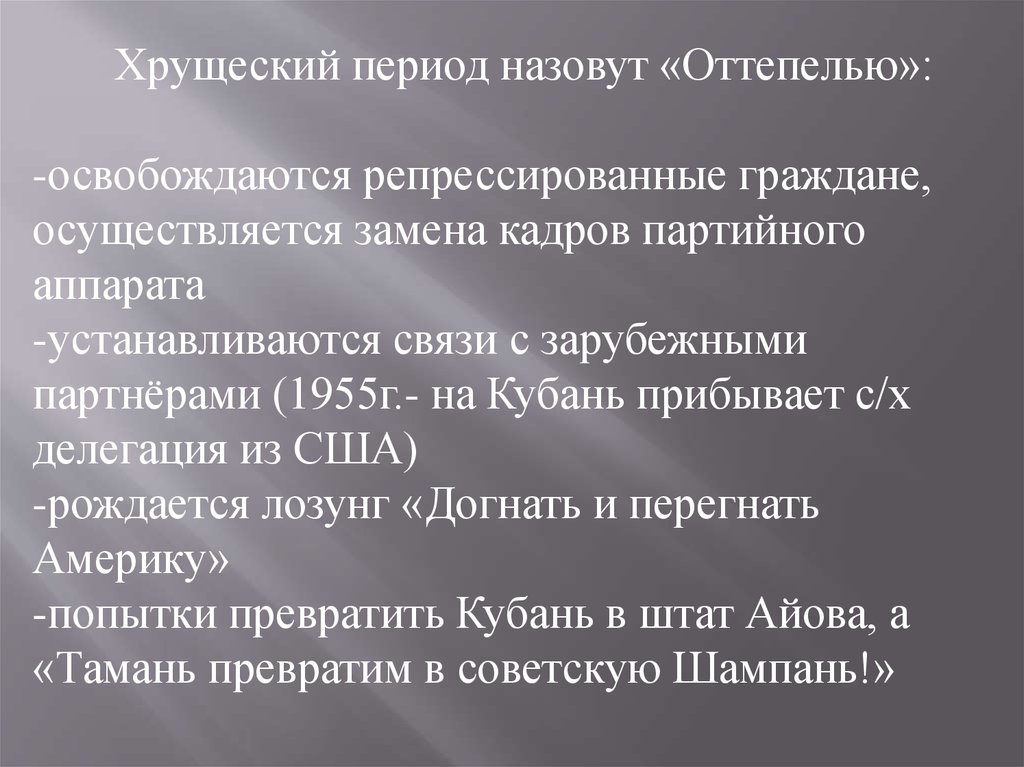 Хрущеский период назовут «Оттепелью»:-освобождаются репрессированные граждане,